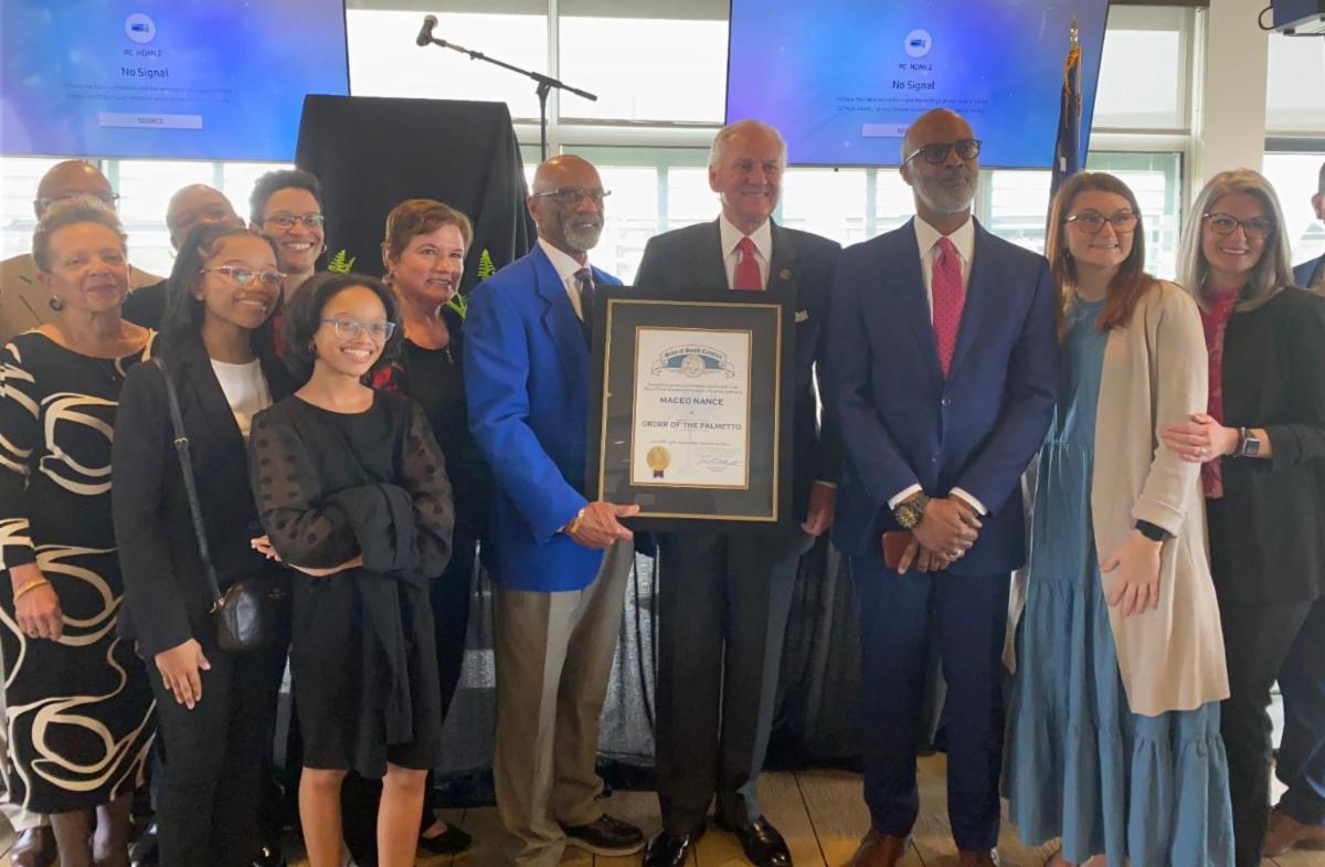 S.C. Commerce Special Advisor Maceo Nance (fifth from right), surrounded by family and friends, poses with Governor Henry McMaster (fourth from right) after being awarded the Order of the Palmetto Tuesday, March 5, 2024.